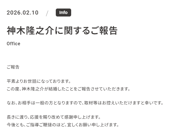 - 2026年2月10日、神木隆之介さんは一般女性との結婚を電撃発表した