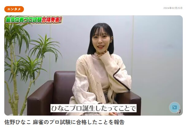 - 佐野ひなこさんは現在、競技麻雀のプロ棋士として2024年最高位戦リーグに合格し活躍中