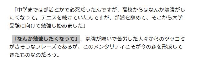 森さんは後に私立大学の文系(早稲田大学法学部)に進学していることから、東大コースか難関大コースのいずれかに在籍していたと考えられます。いずれにしても、県内でもトップレベルの進学校で学んでいたことは間違いありません。
