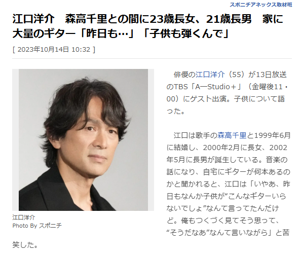 江口洋介さんのプライベートでも嬉しい話題が続いています。1999年6月に歌手の森高千里さんと結婚し、2026年時点でなんと結婚26年目を迎えます。2000年2月に長女が、2002年5月に長男が誕生しており、現在は長女が26歳、長男が24歳ほどになっています。