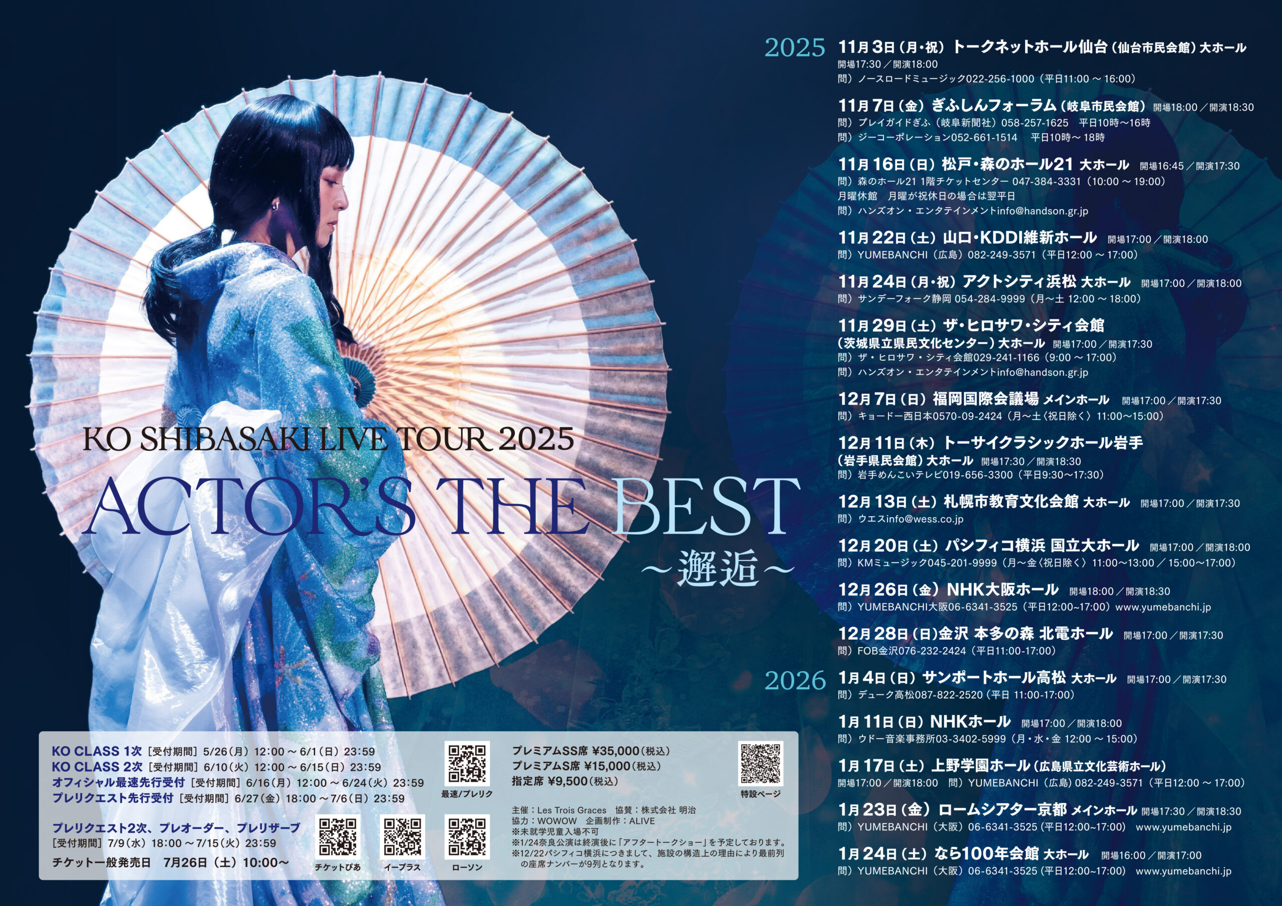 音楽活動においても積極的で、2025年10月22日にはEP「邂逅(かいこう)」をリリース。さらに11月から翌2026年1月にかけて、全国17都市でライブツアー「KO SHIBASAKI LIVE TOUR 2025 ACTOR’S THE BEST 〜邂逅〜」を開催しました。仙台・岐阜・松戸・山口・浜松・札幌・横浜・大阪・金沢・高松・東京NHKホール・広島・京都・奈良など、多くの地で歌声を届けています。