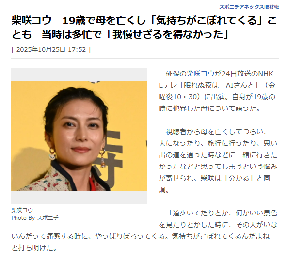 - 母親は2000年、柴咲コウさんが19歳のときに乳がんで亡くなっています