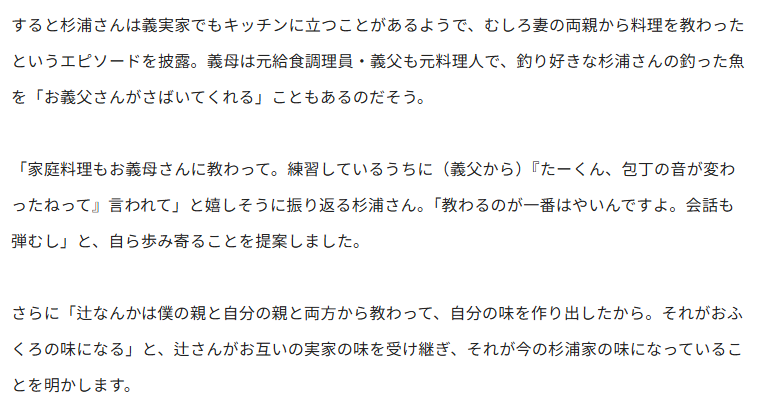 義父にあたる杉浦太陽さんとも良好な関係で、杉浦さんは「義父から包丁の使い方を教わった」というエピソードを披露しており、婿と義父の仲睦まじい関係も伝わってきます。