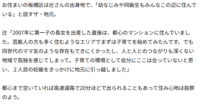 辻さんは2007年の第一子出産直後、最初は都心の芸能人も多く住むマンションに住んでいましたが、「同世代のママ友ができにくく、人とのつながりが薄い地域で孤独を感じた」と当時を振り返っています。第二子の妊娠を機に地元板橋区へ戻り、以来ずっとこのエリアに根を張り続けています。