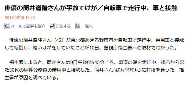 実際に体への影響があったのは2013年6月の自転車事故です。東京都あきる野市内で自転車走行中に乗用車と接触して転倒し、ひざとひじに打撲を負いました。この事故は警視庁福生署への取材で明らかになったもので、深刻なケガではありませんでした。
